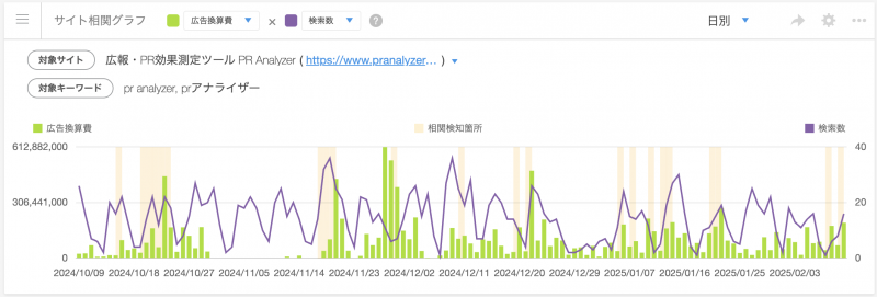 記事データとWebアクセスデータの相関を自動検知する機能(画面は掲載記事のリーチ数と検索数の相関)